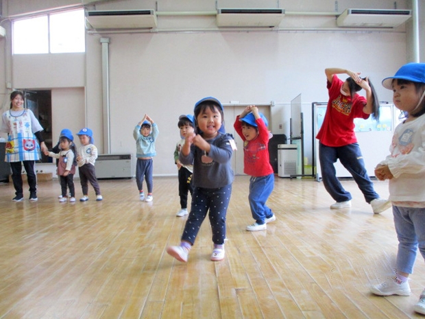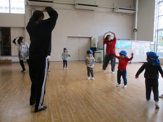 ジャクパスポーツクラブの体育講師による体育指導。今日はリズムダンス講師と音楽に合わせて体を動かしました。