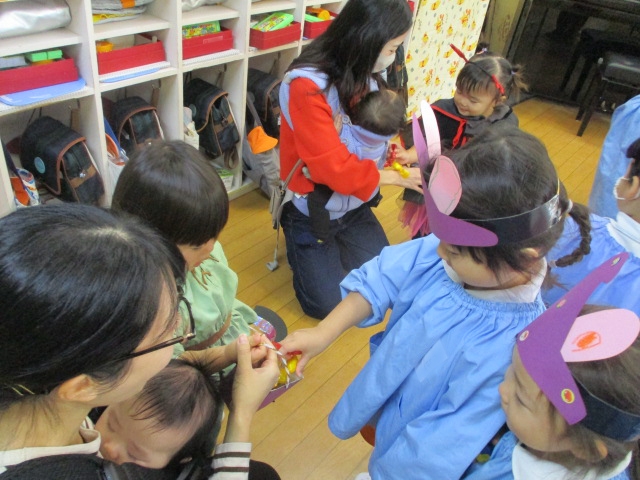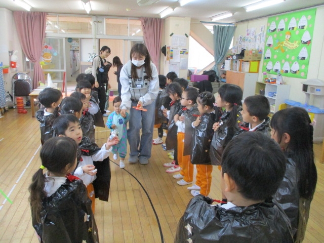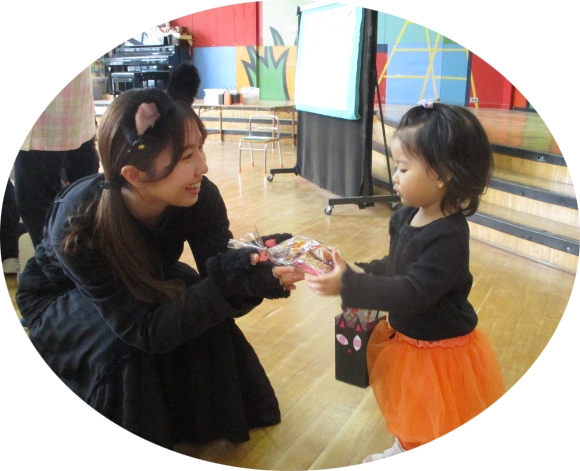 仮装した未就園児のお友だちも仮装してきてくれて、在園の子どもたちも各クラスで仮装し、お菓子を配りふれあいました。