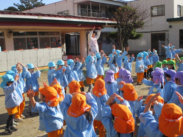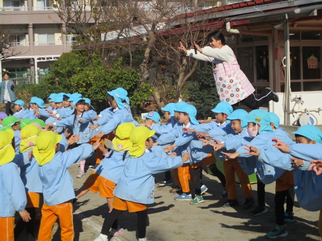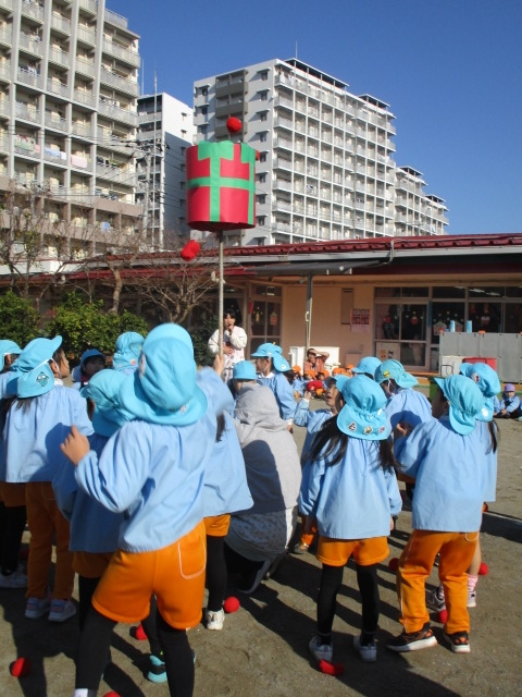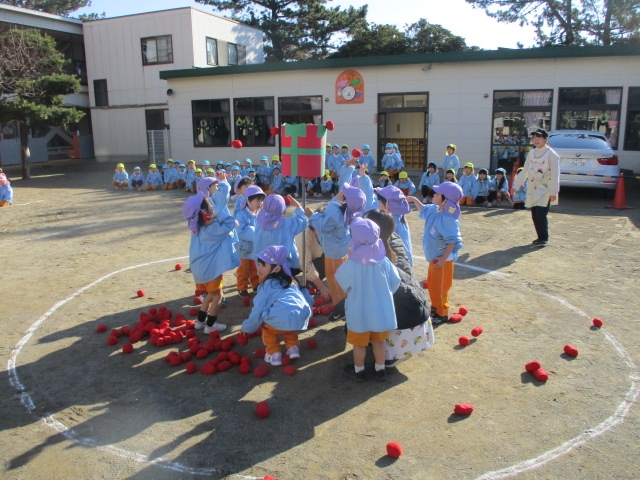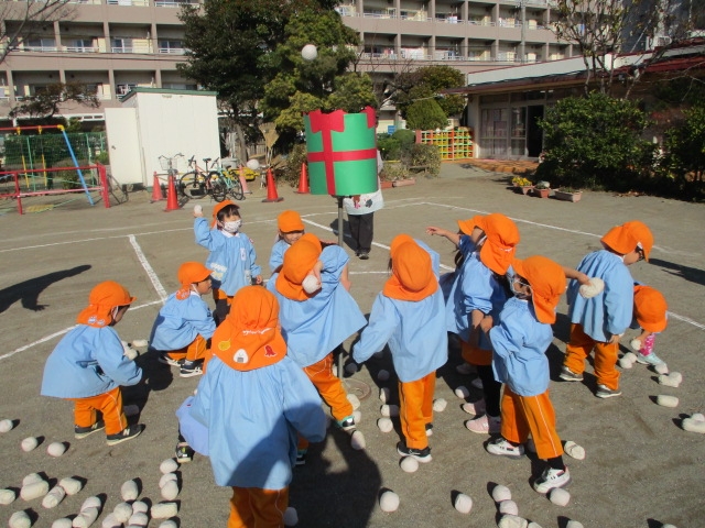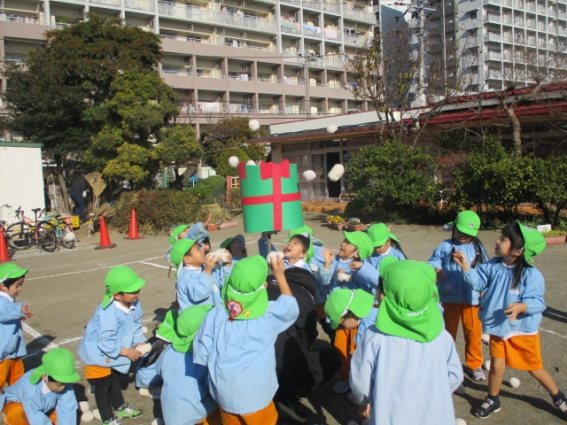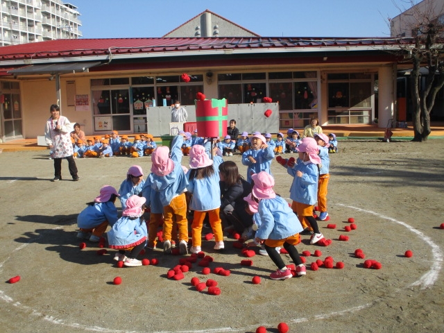 今回はロケットぺんぎんの音楽に合わせてみんなで踊り、クラス対抗でプレゼント玉入れを行いました。