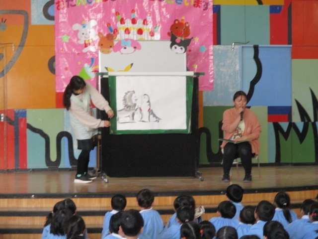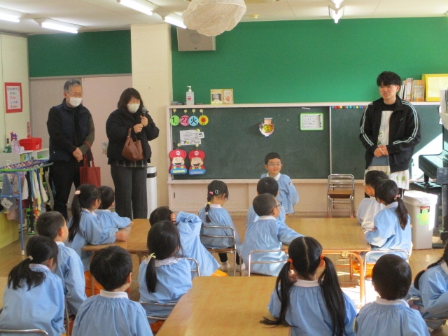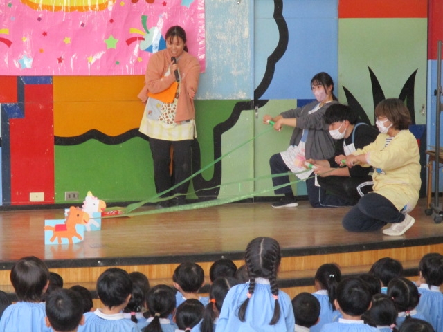先生からは出し物と大型絵本のプレゼント🎁先生からの出し物では、担任の先生たちが福笑いに挑戦し、子どもたちも声掛けをして助けてくれました😆
