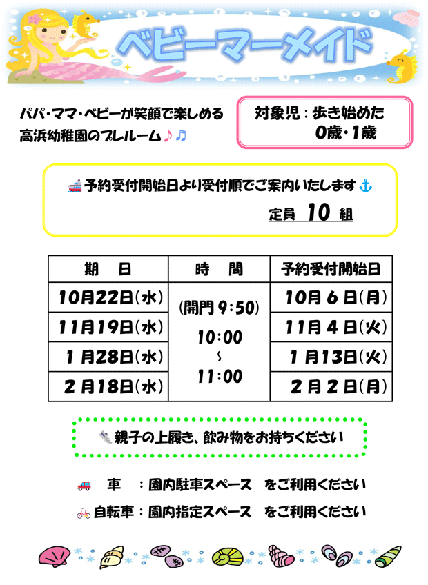 ベビーマーメイドは、パパ・ママ・ベビーが笑顔で楽しめる、高浜幼稚園の 「プレルーム」です🐠💛